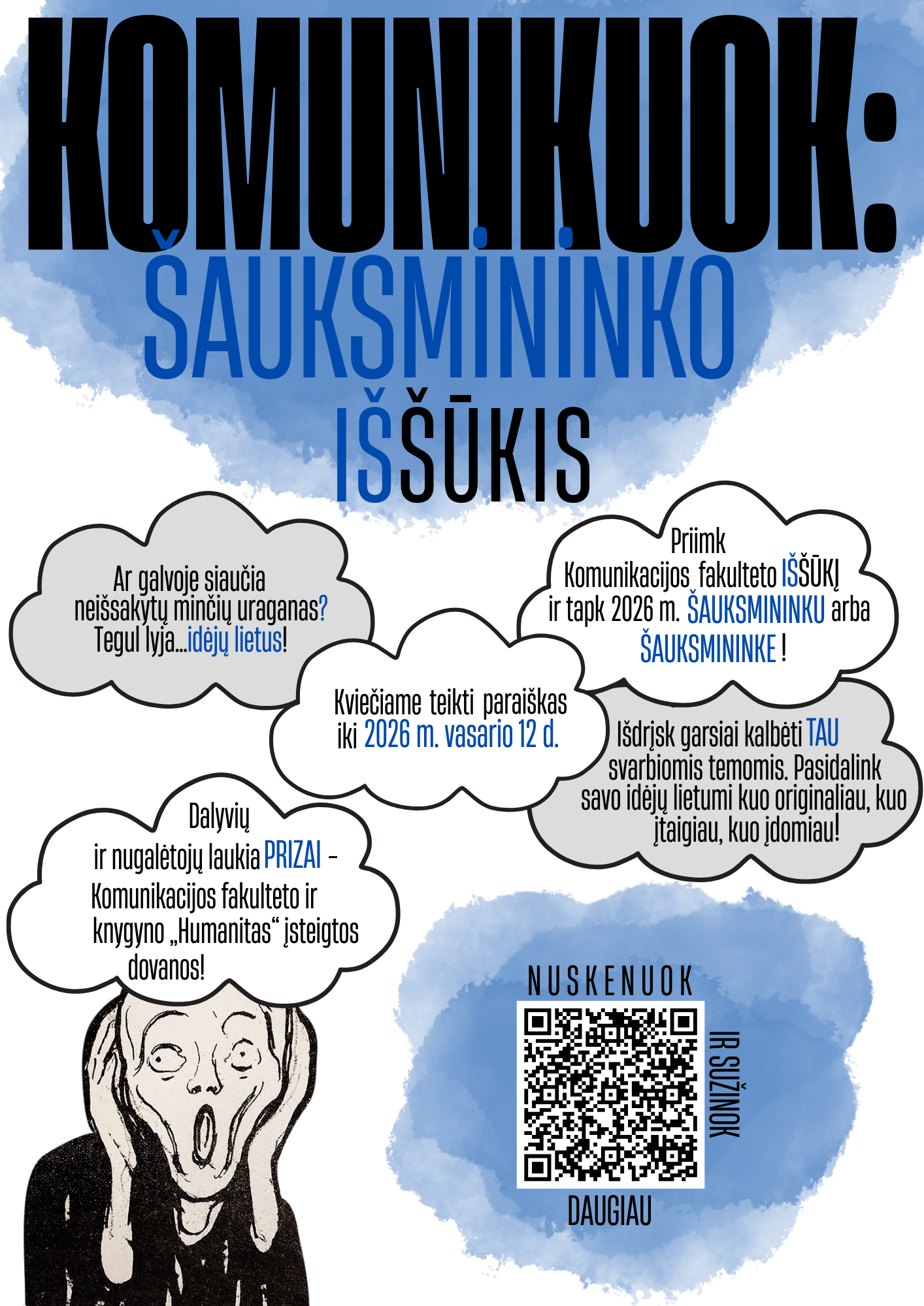 Su visomis konkurso taisyklėmis, eiga ir dalyviams keliamais reikalavimais kviečiame susipažinti tvarkos apraše: Konkurso „KOMUNIKUOK: ŠAUKSMININKO (IŠ)ŠŪKIS“ vykdymo tvarkos aprašas.
